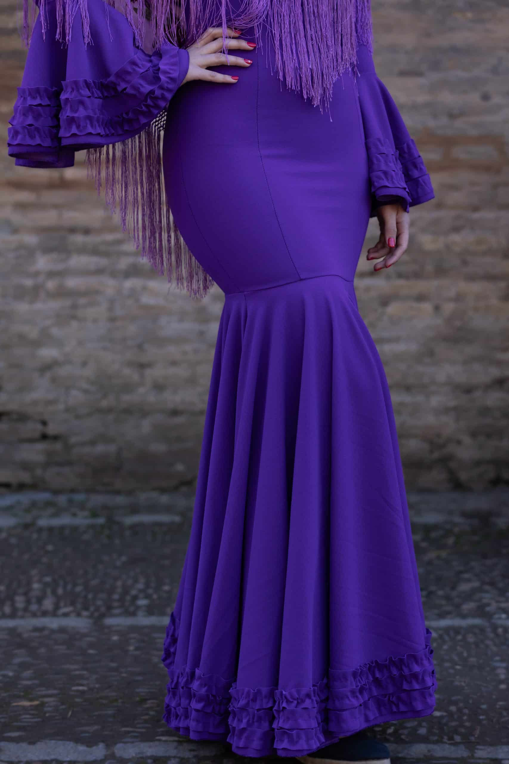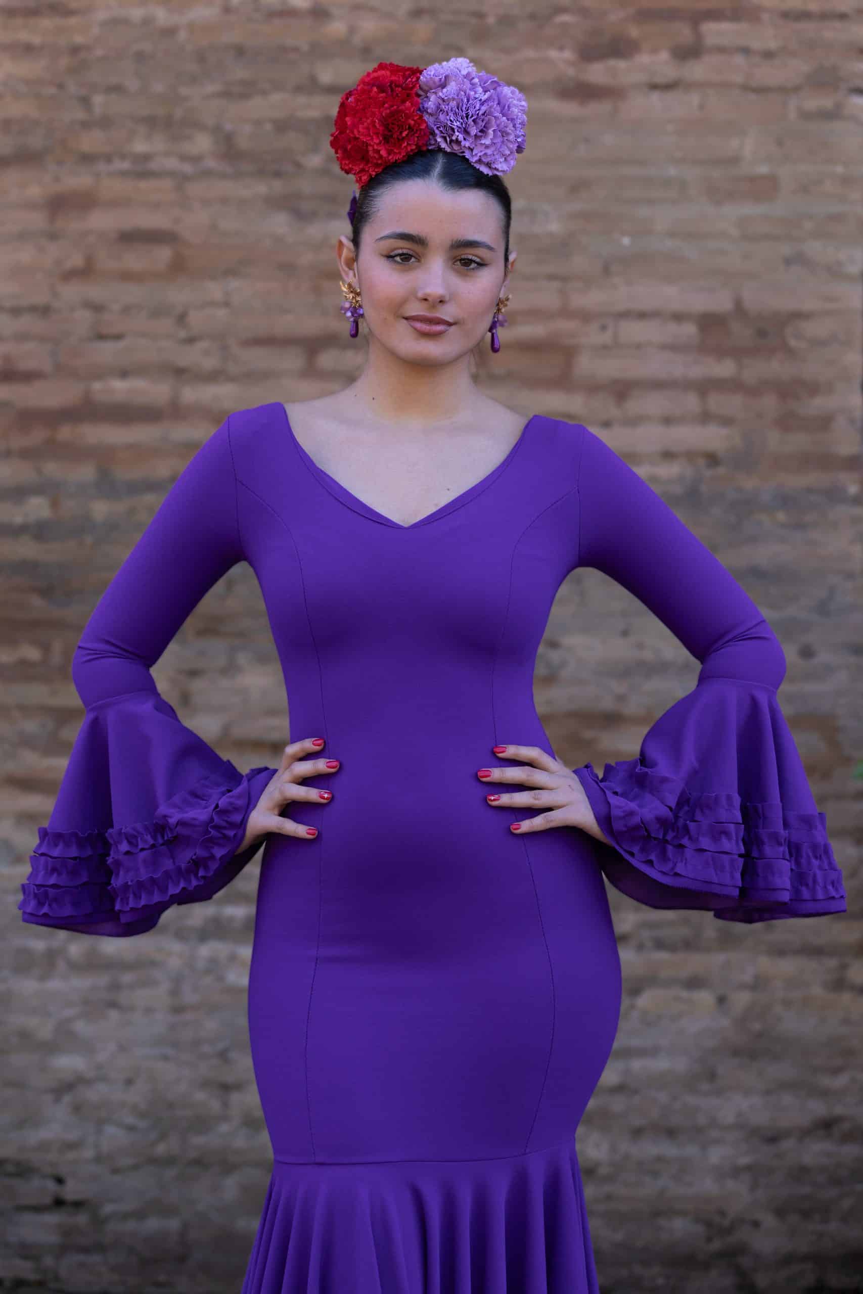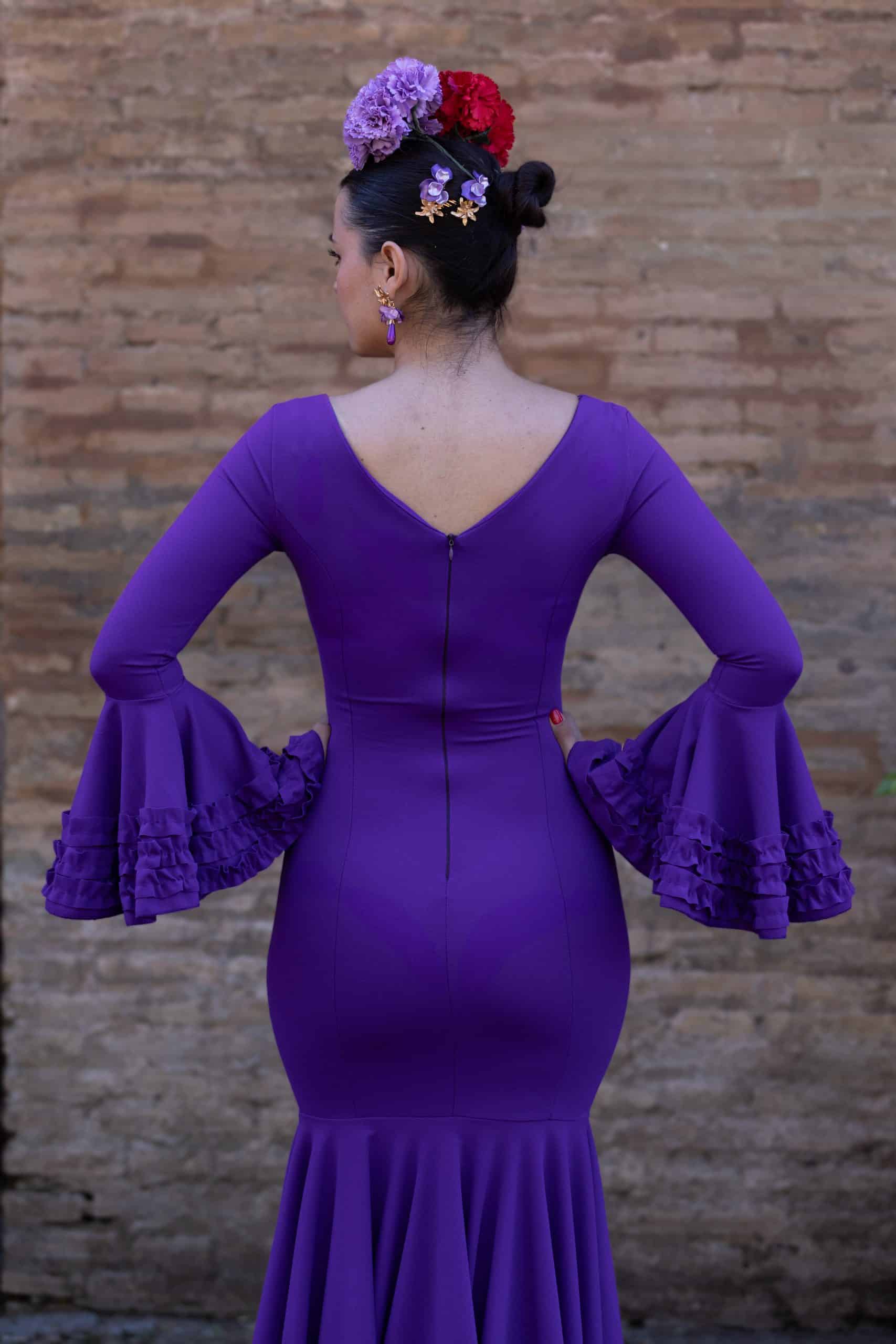 Traje de flamenca low cost elástico en color morado canastero con cuello en pico.