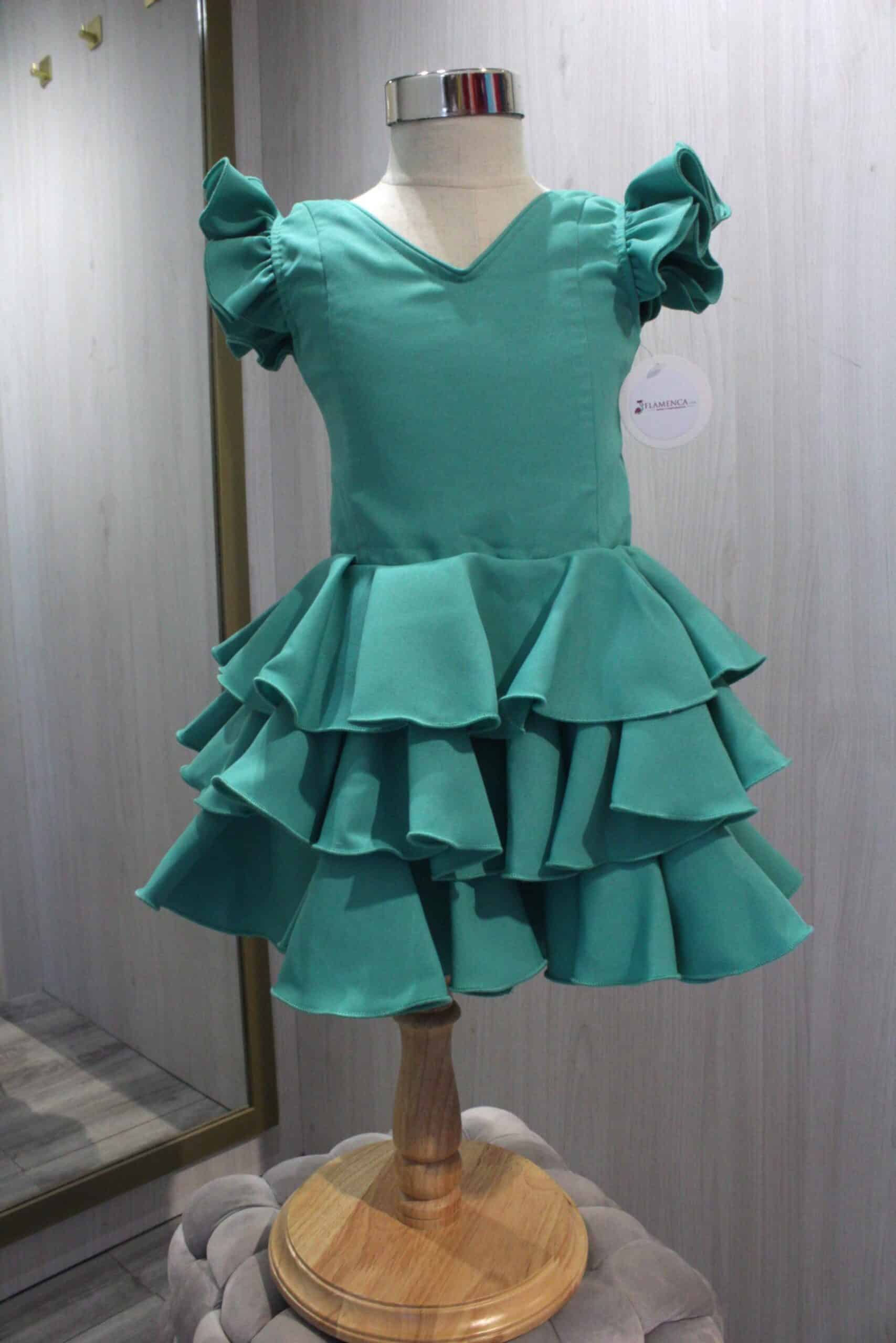 Traje de flamenca niña corto , modelo Triana, de color aguamarina.