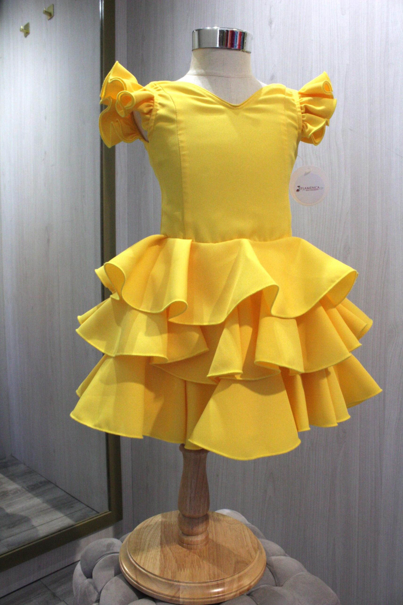 Traje de flamenca niña corto, modelo Manuela, de color amarillo.