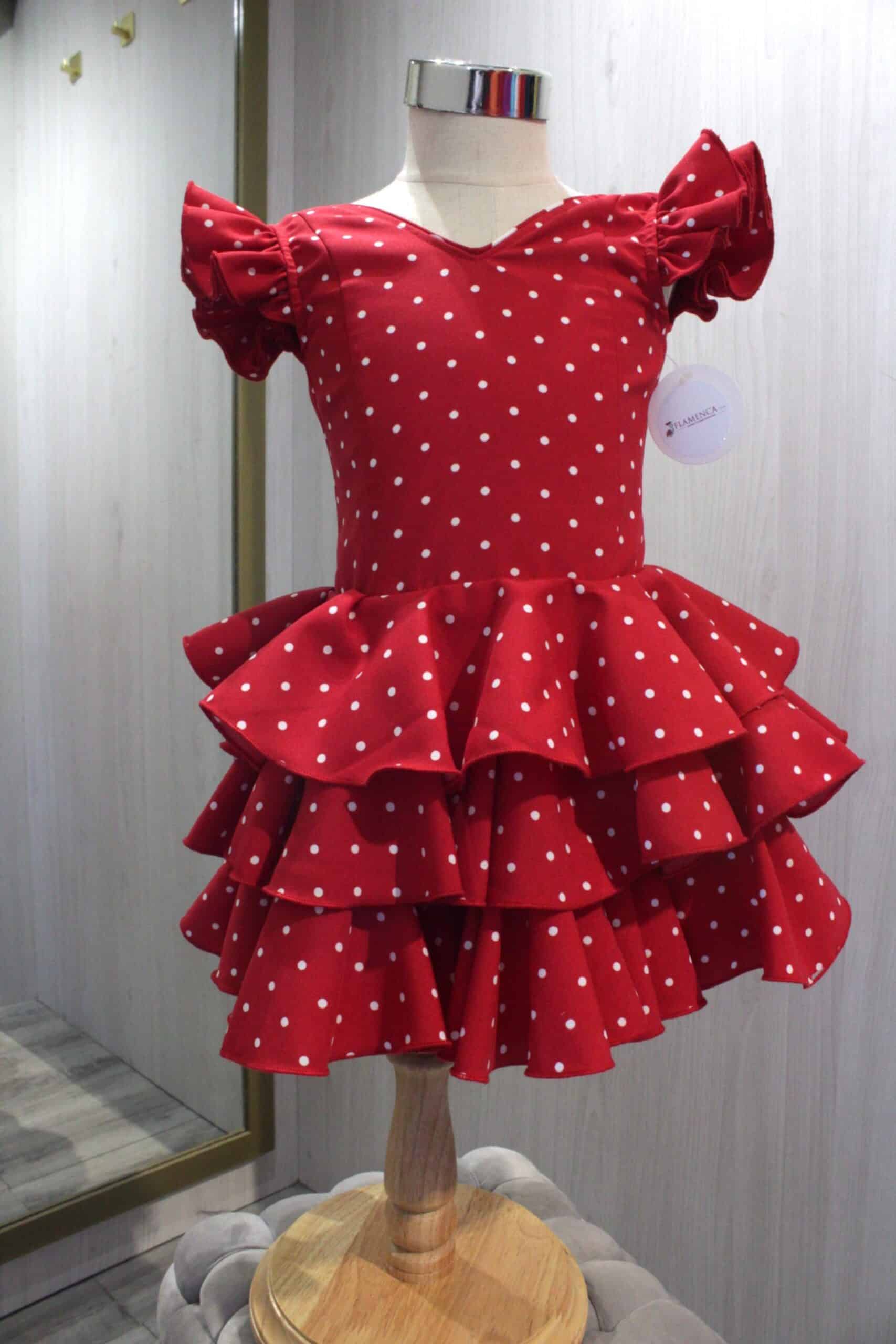 Traje de flamenca niña corto, modelo Manuela, de color rojo.
