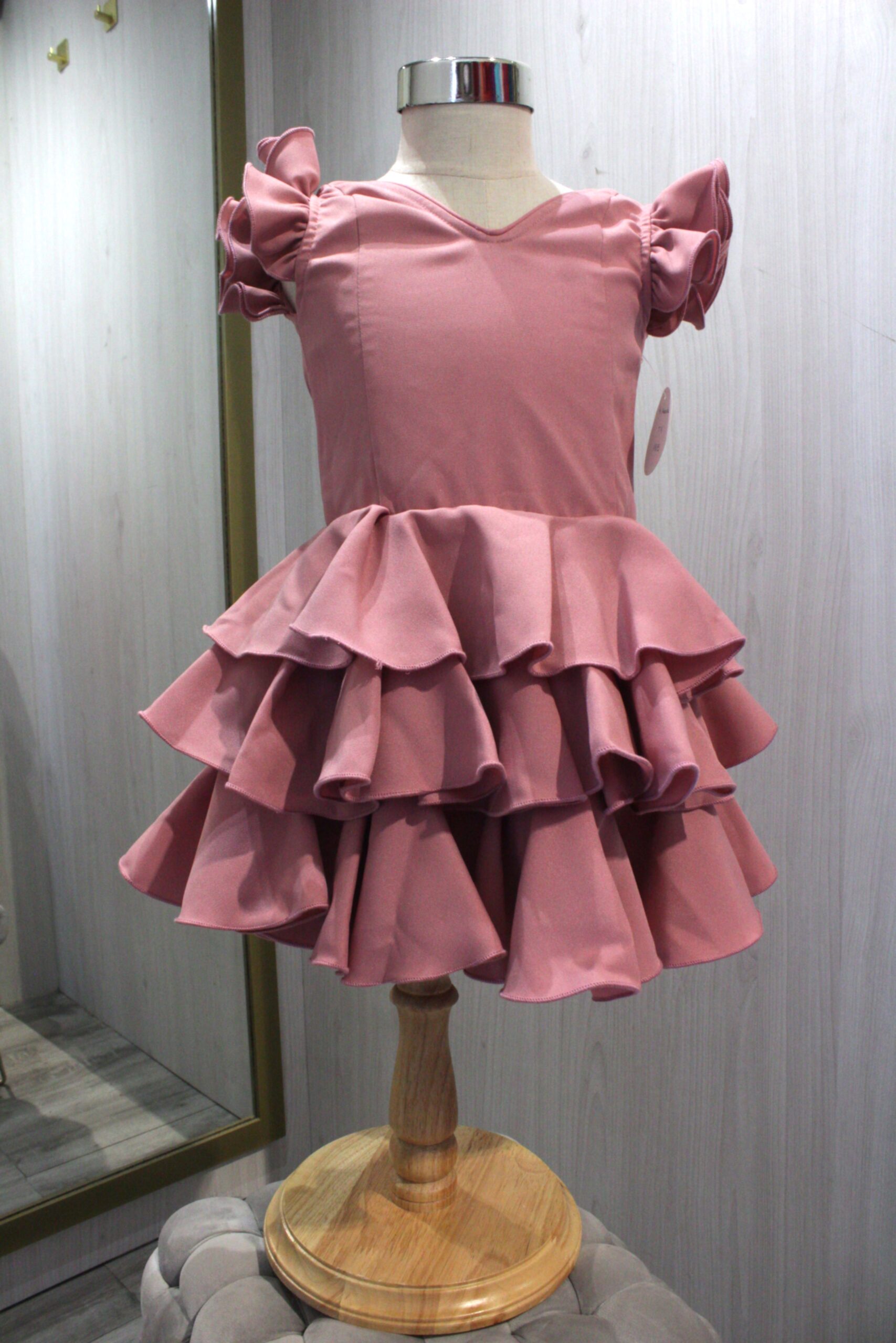 Traje de flamenca niña corto, modelo Manuela, de color rosa maquillaje.
