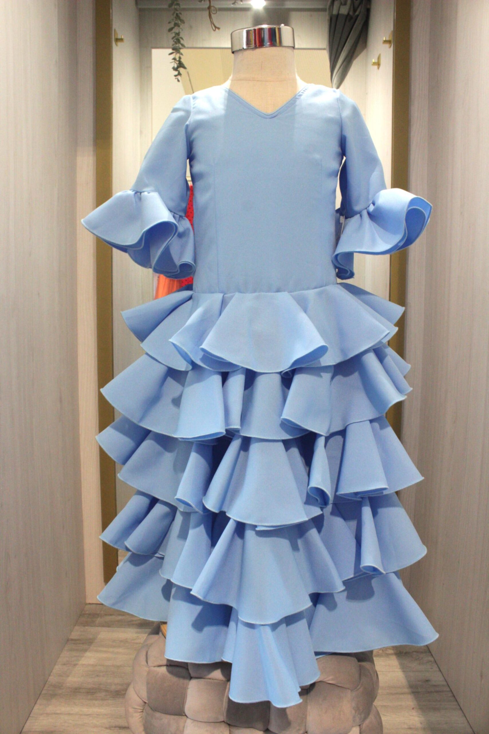 Traje de flamenca niña corto, modelo Marieta, de color azul cielo.
