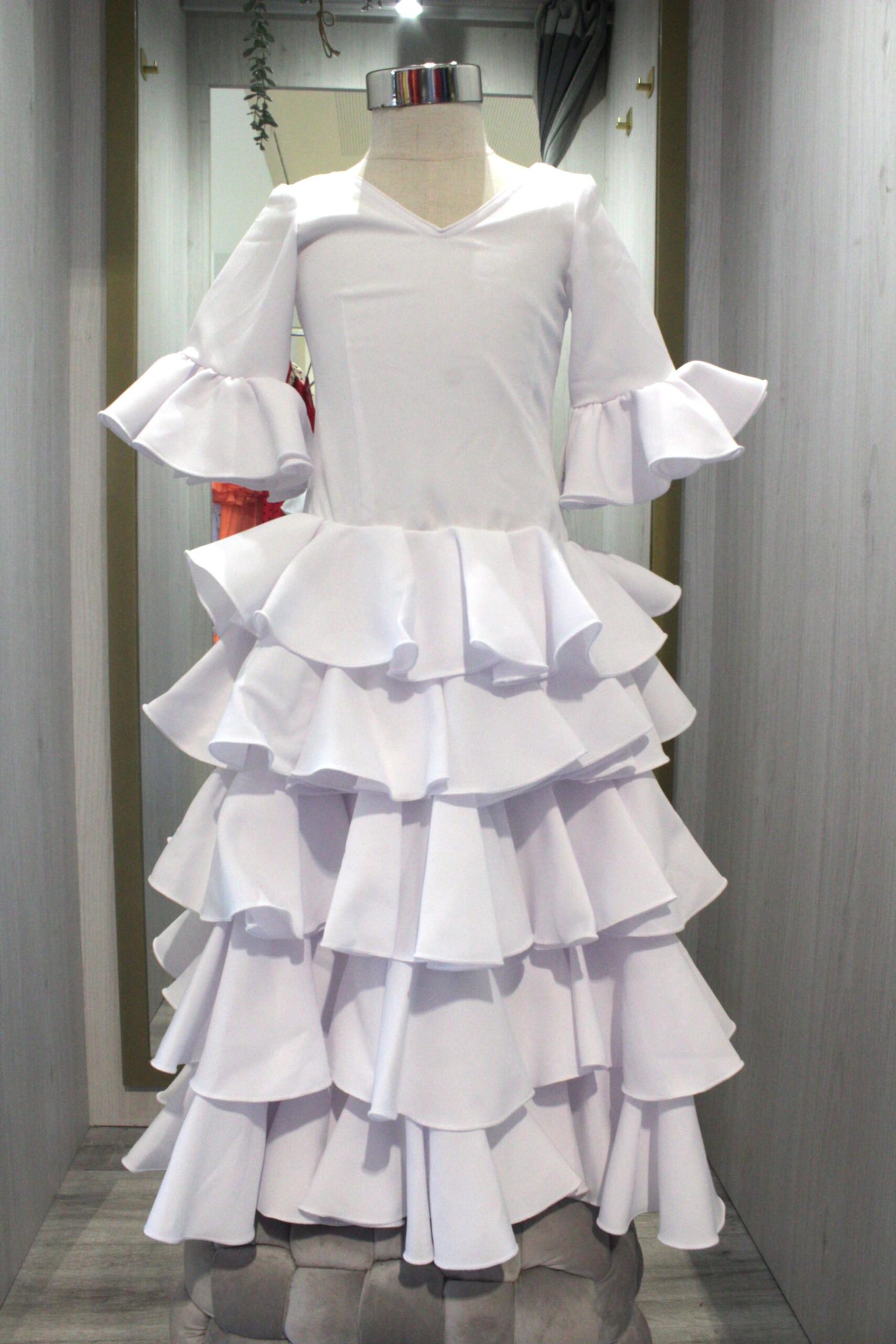 Traje de flamenca niña corto, modelo Marieta, de color blanco.