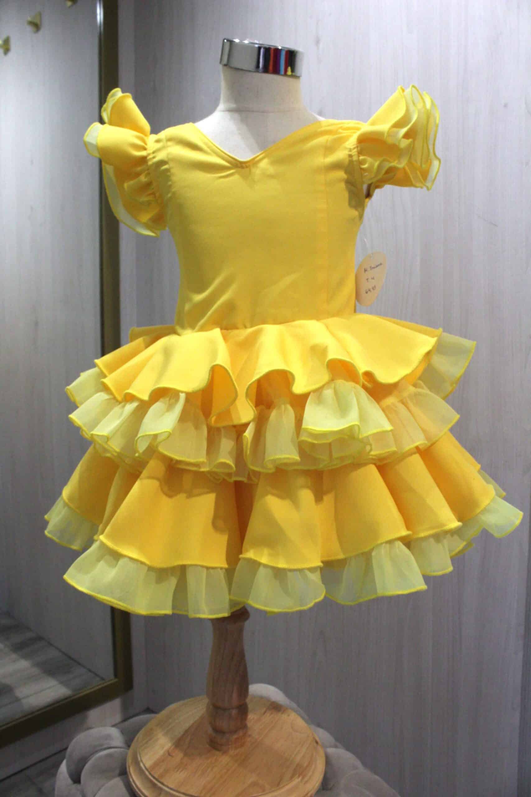 Traje de flamenca niña corto, modelo Triana de color rosa maquillaje y remates de organdil.