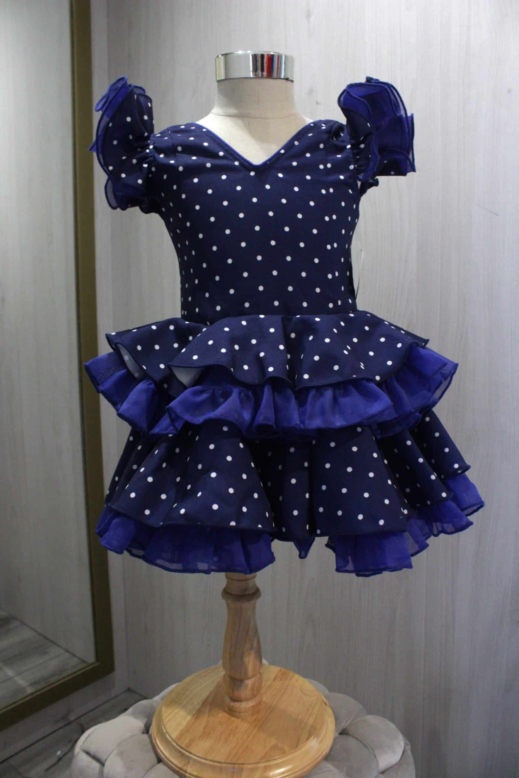 Traje de flamenca niña corto , modelo Triana, de color azul marino con lunares blancos con remates de organdil.