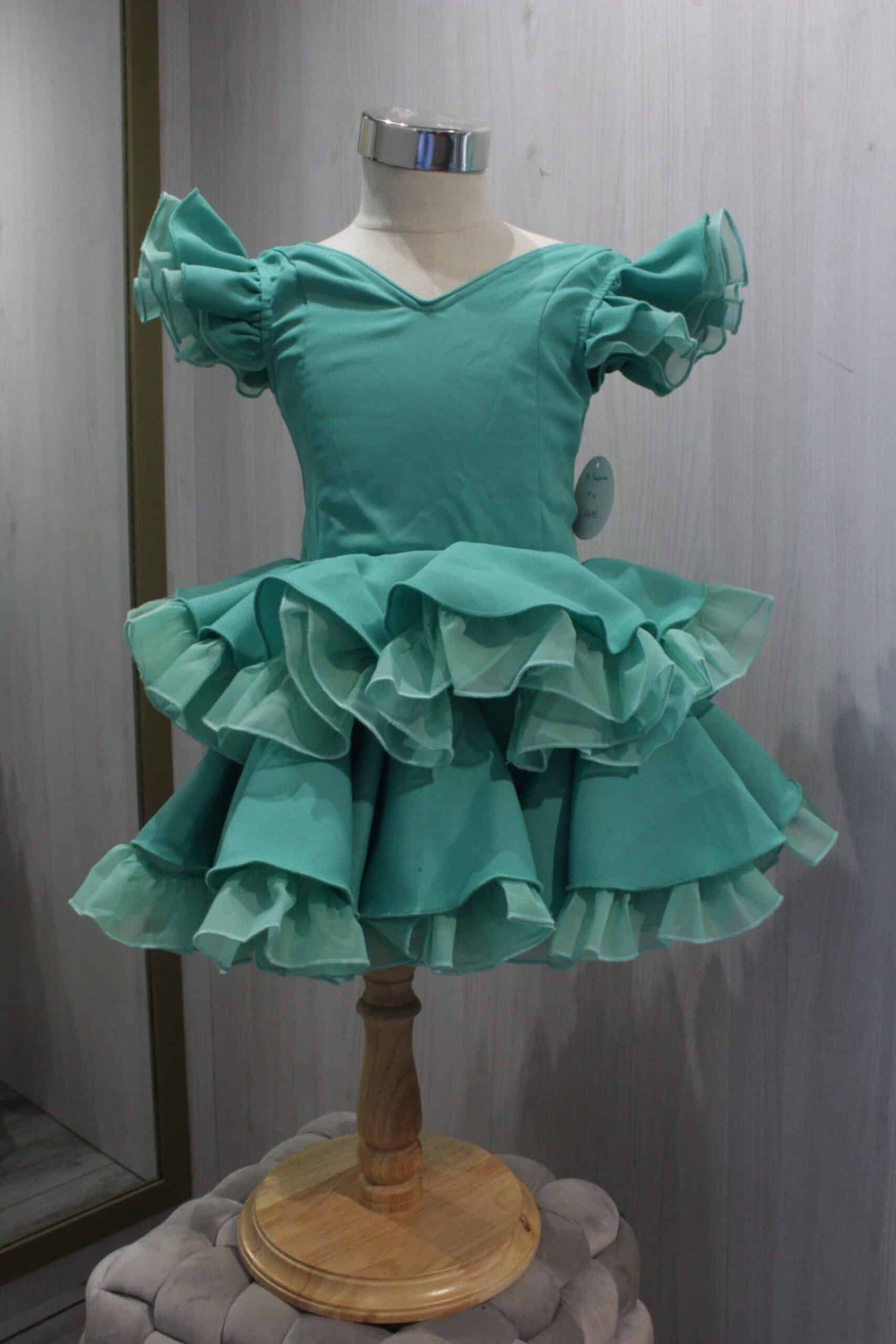 Traje de flamenca niña corto , modelo Triana, de color verde agua con remates de organdil.