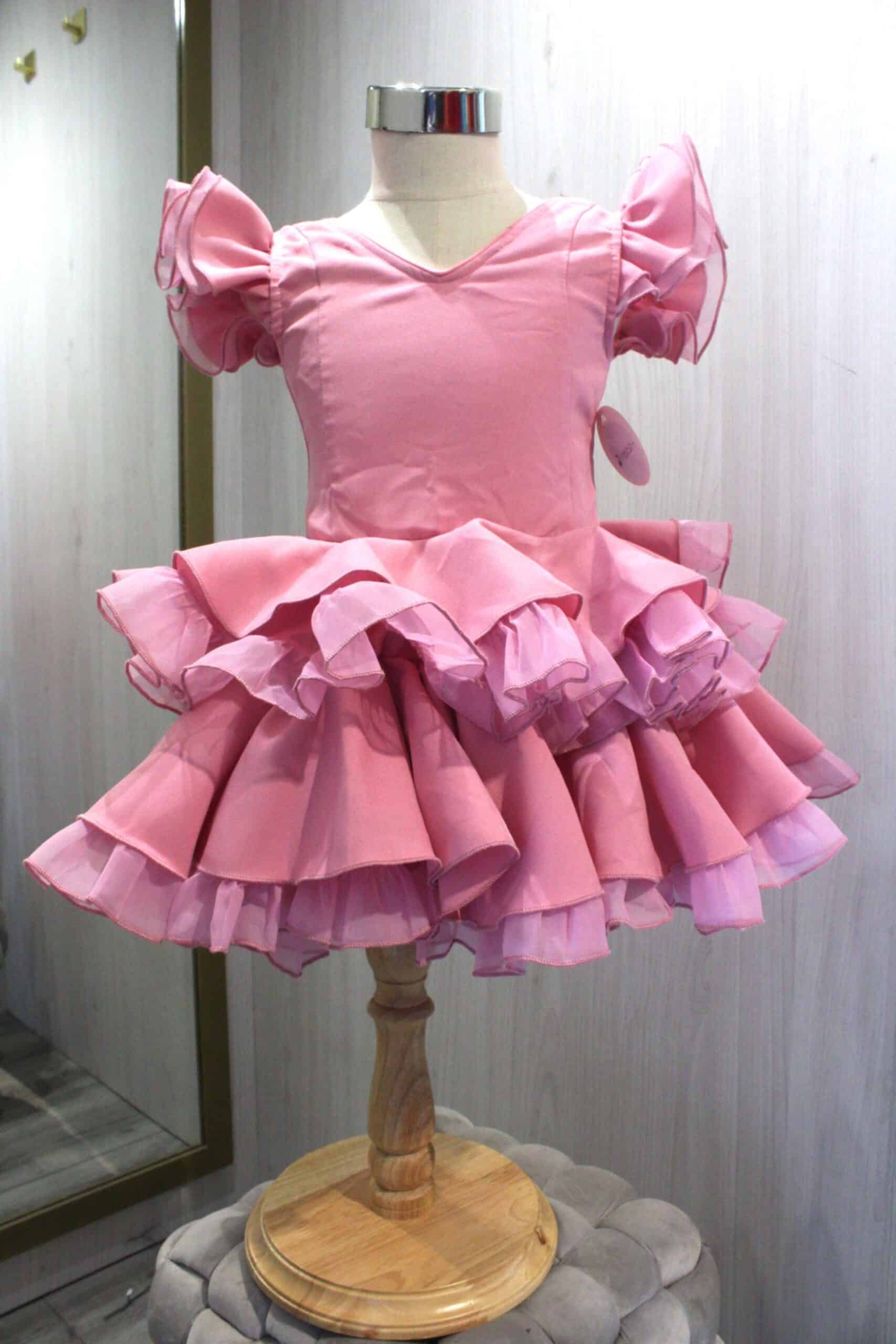 Traje de flamenca niña corto , modelo Triana, de color maquillaje con remates de organdil.