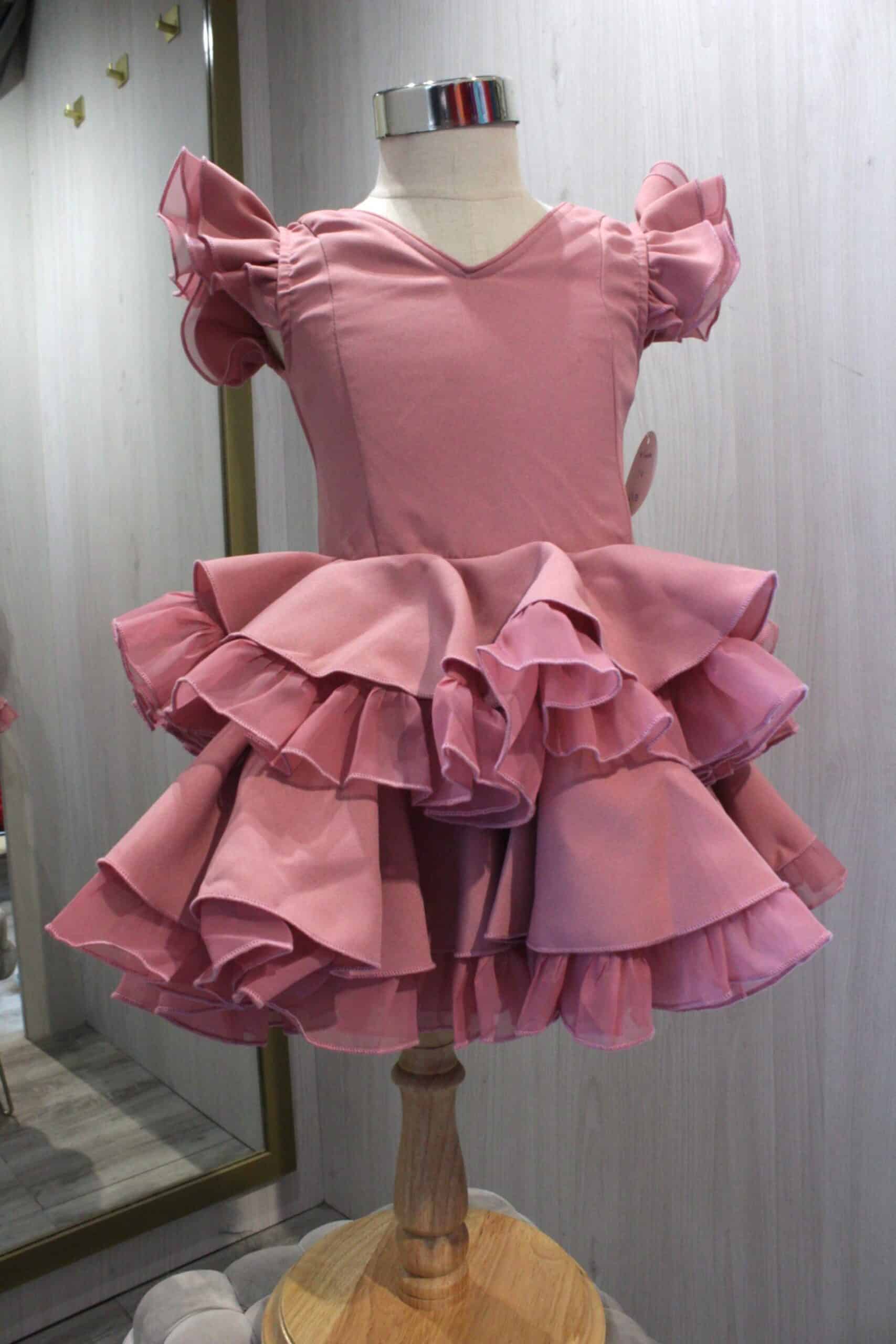 Traje de flamenca niña corto, modelo Triana de color rosa maquillaje y remates de organdil.