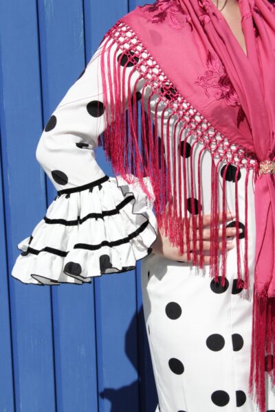 Traje de flamenca de 3 volantes dobles (siendo uno de poliéster y otro de nylon). Media manga