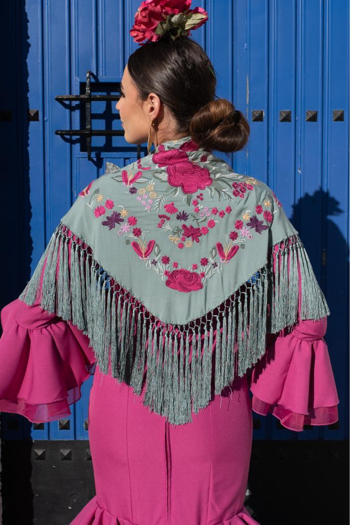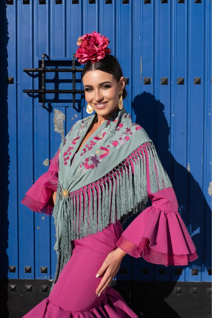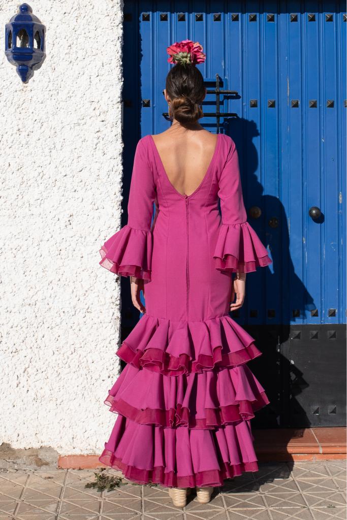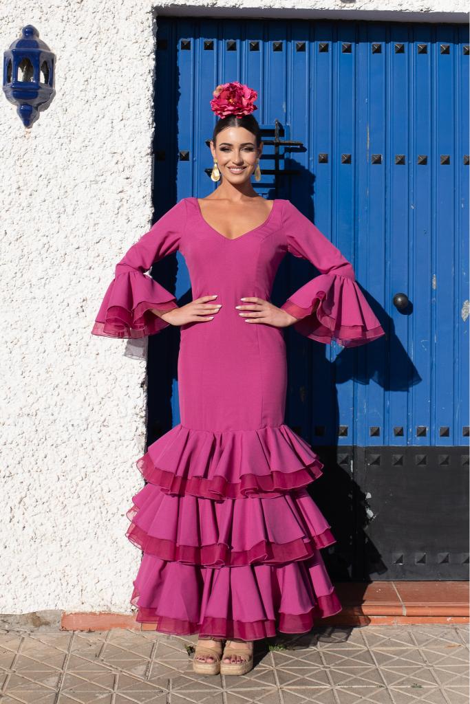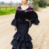 Traje de flamenca de 3 volantes dobles (siendo uno de poliéster y otro de nylon). Media manga
