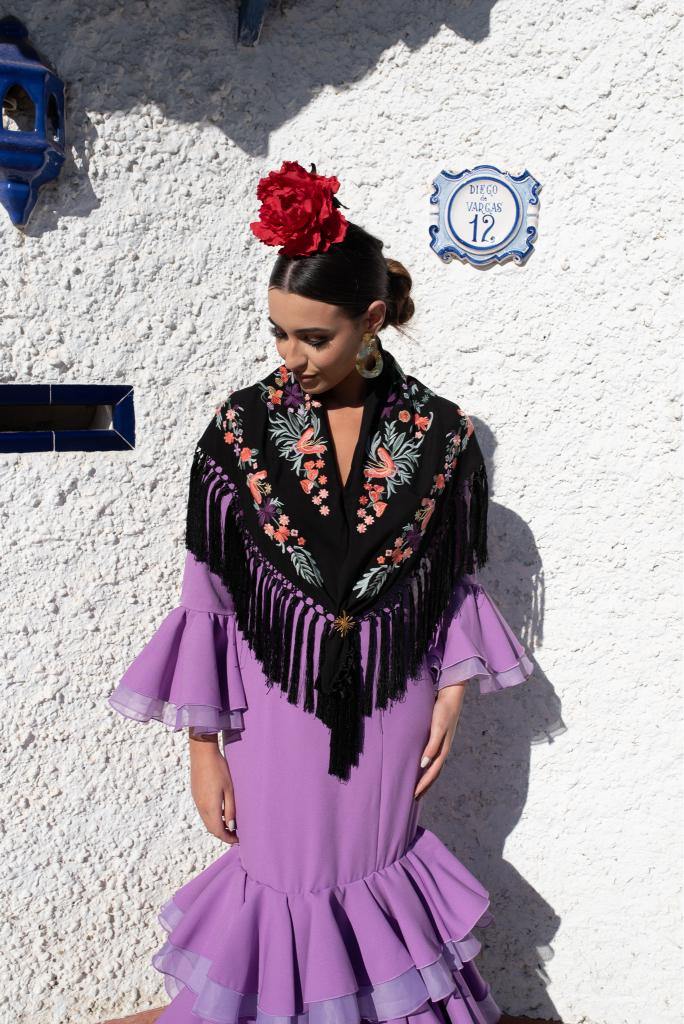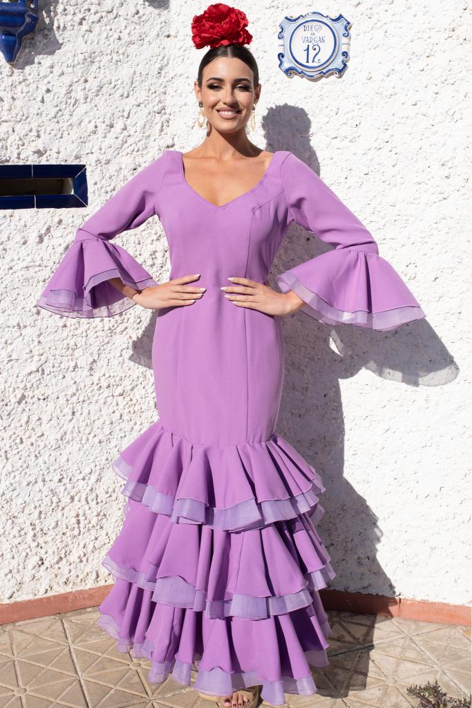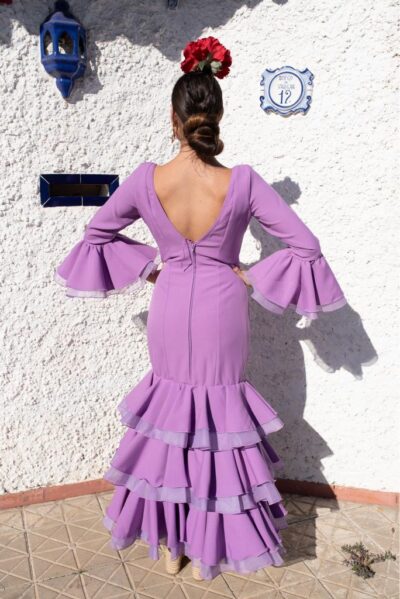 Traje de flamenca de 3 volantes dobles (siendo uno de poliéster y otro de nylon). Media manga