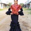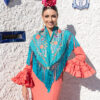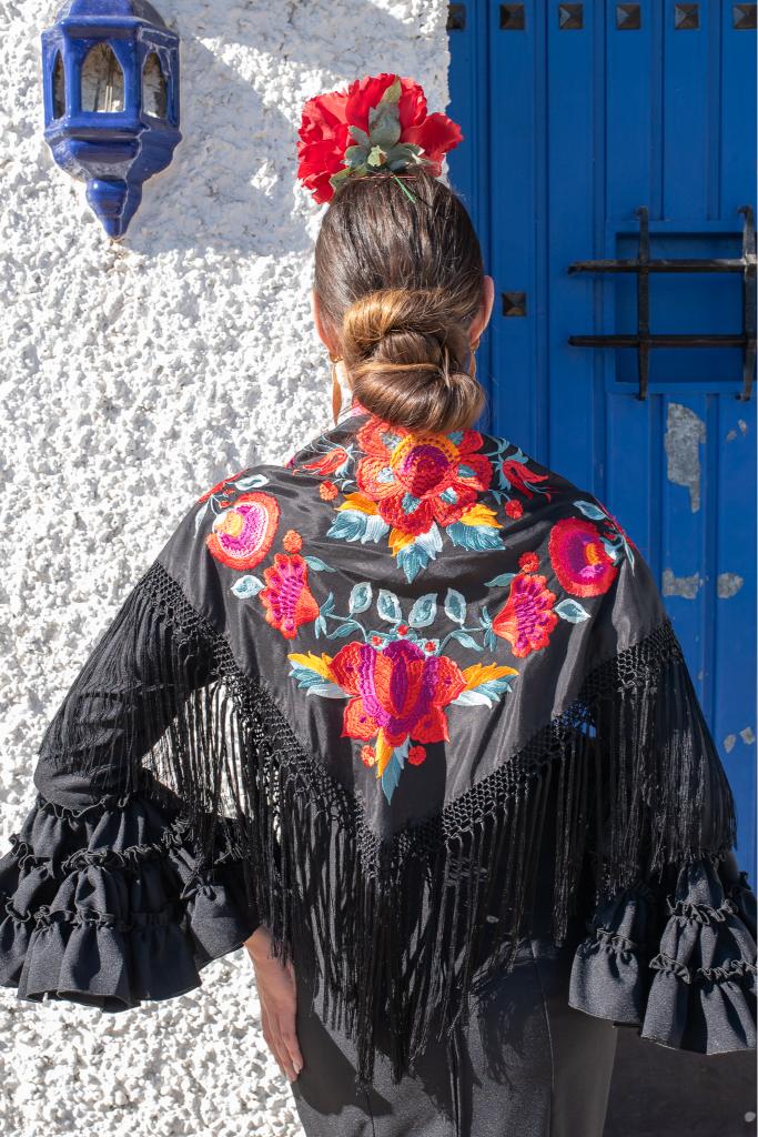 Broche de flamenca multicolor con flor de tela en tono mostaza