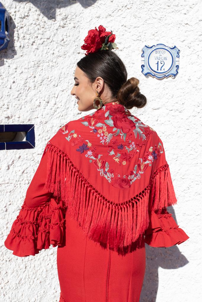 Broche de flamenca multicolor con flor de tela en tono mostaza