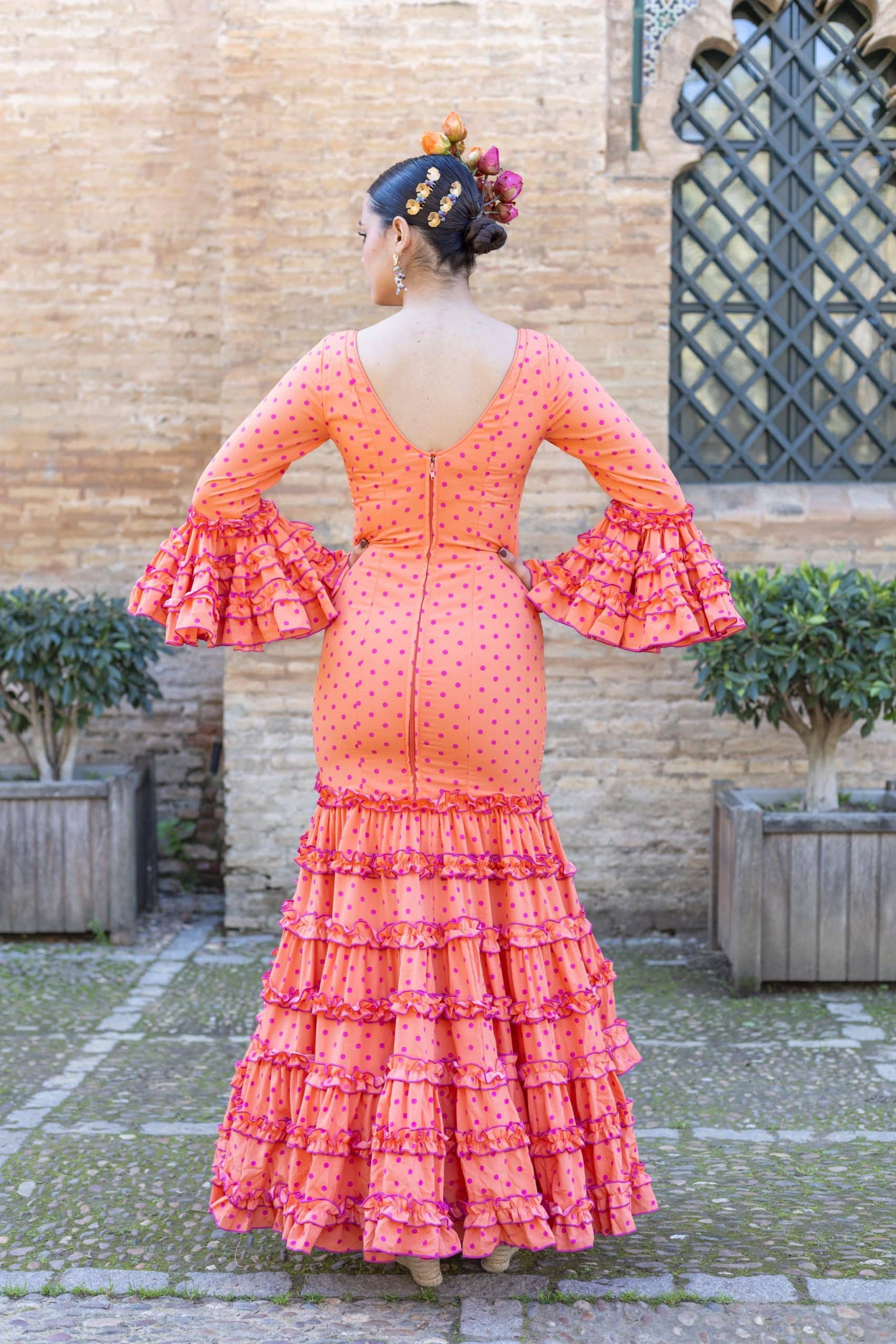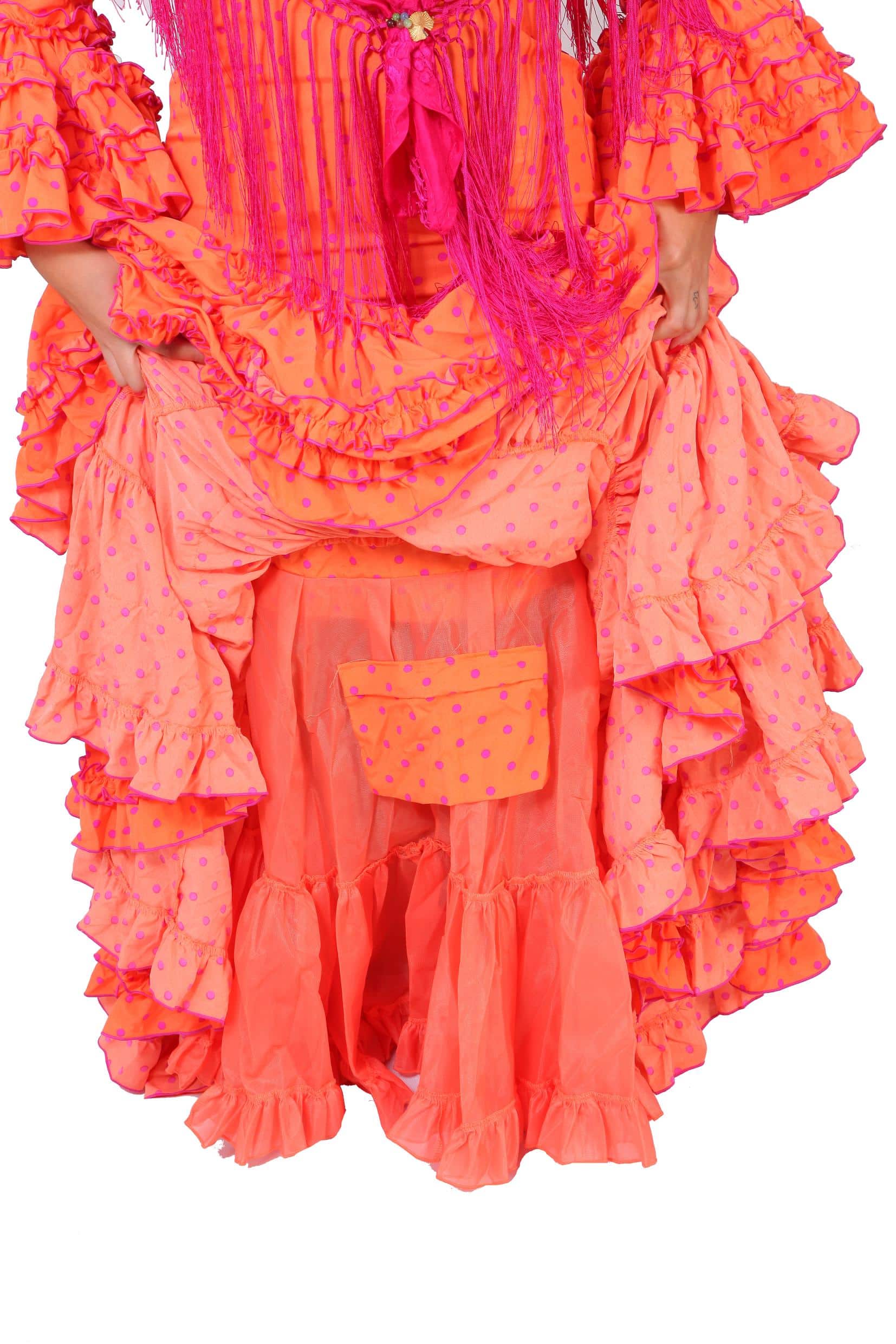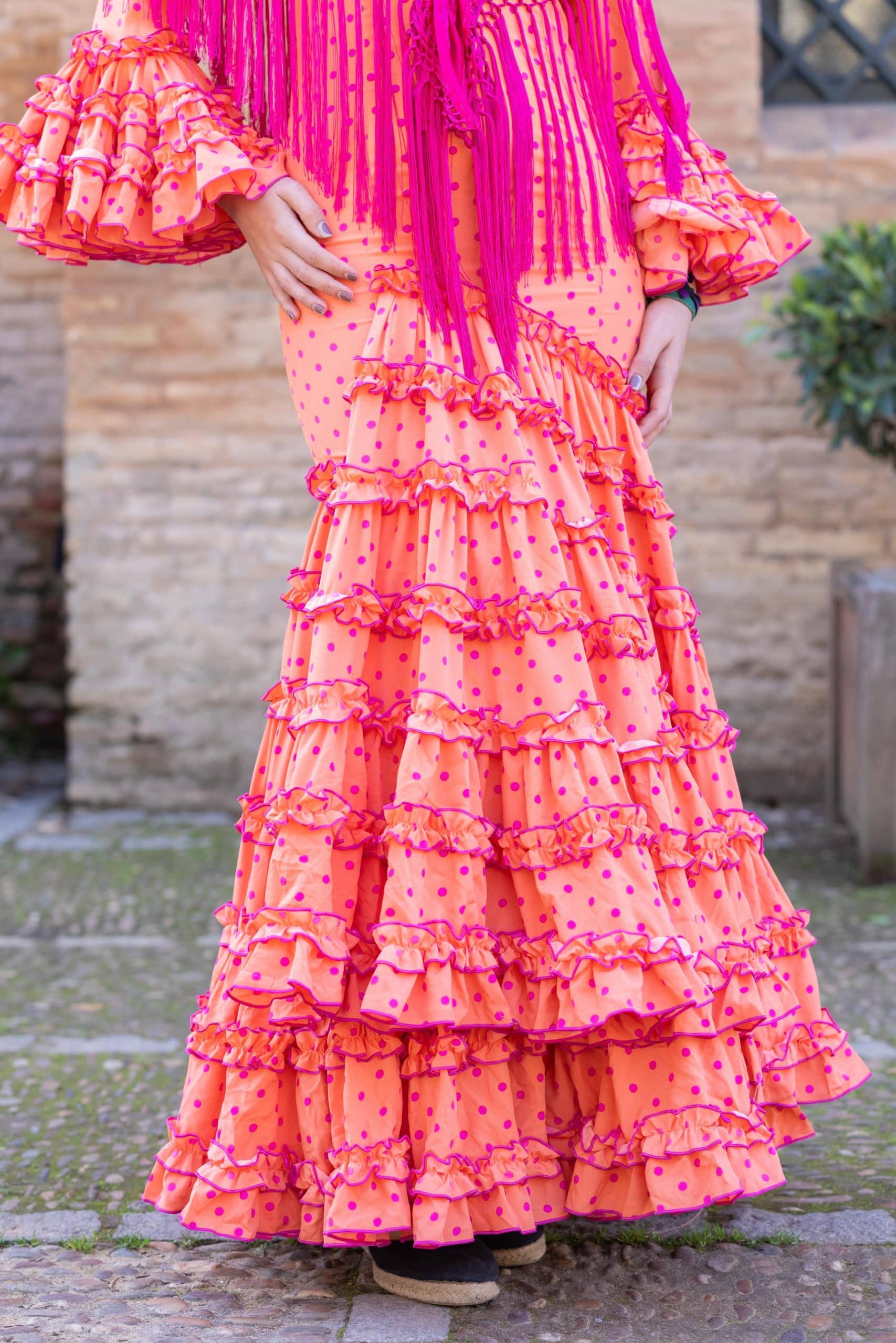 Traje de flamenca con corte canastero y carruchas con subida en pierna derecha color naranja con estampado de lunares rosa fucsia .