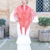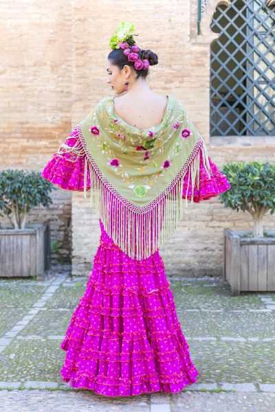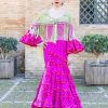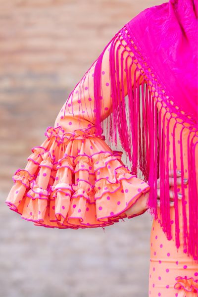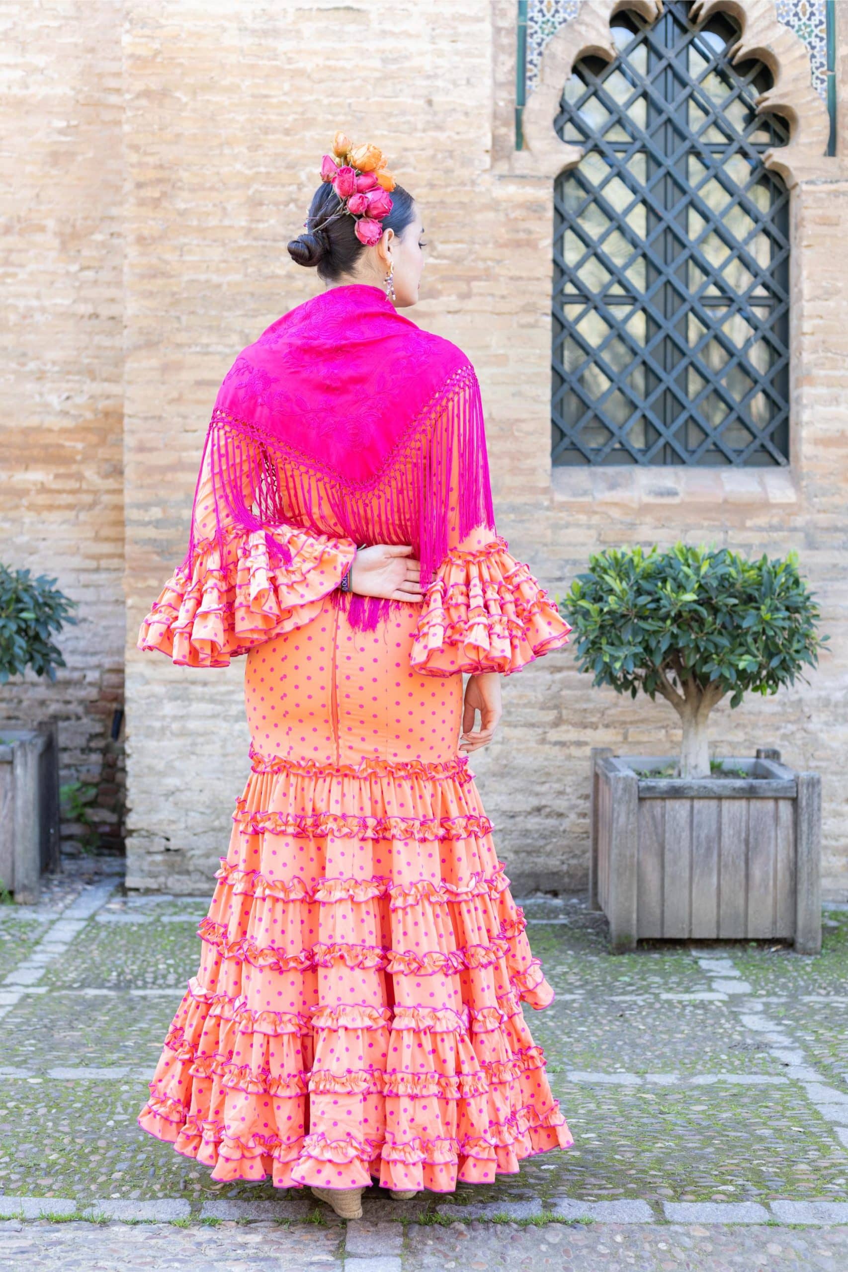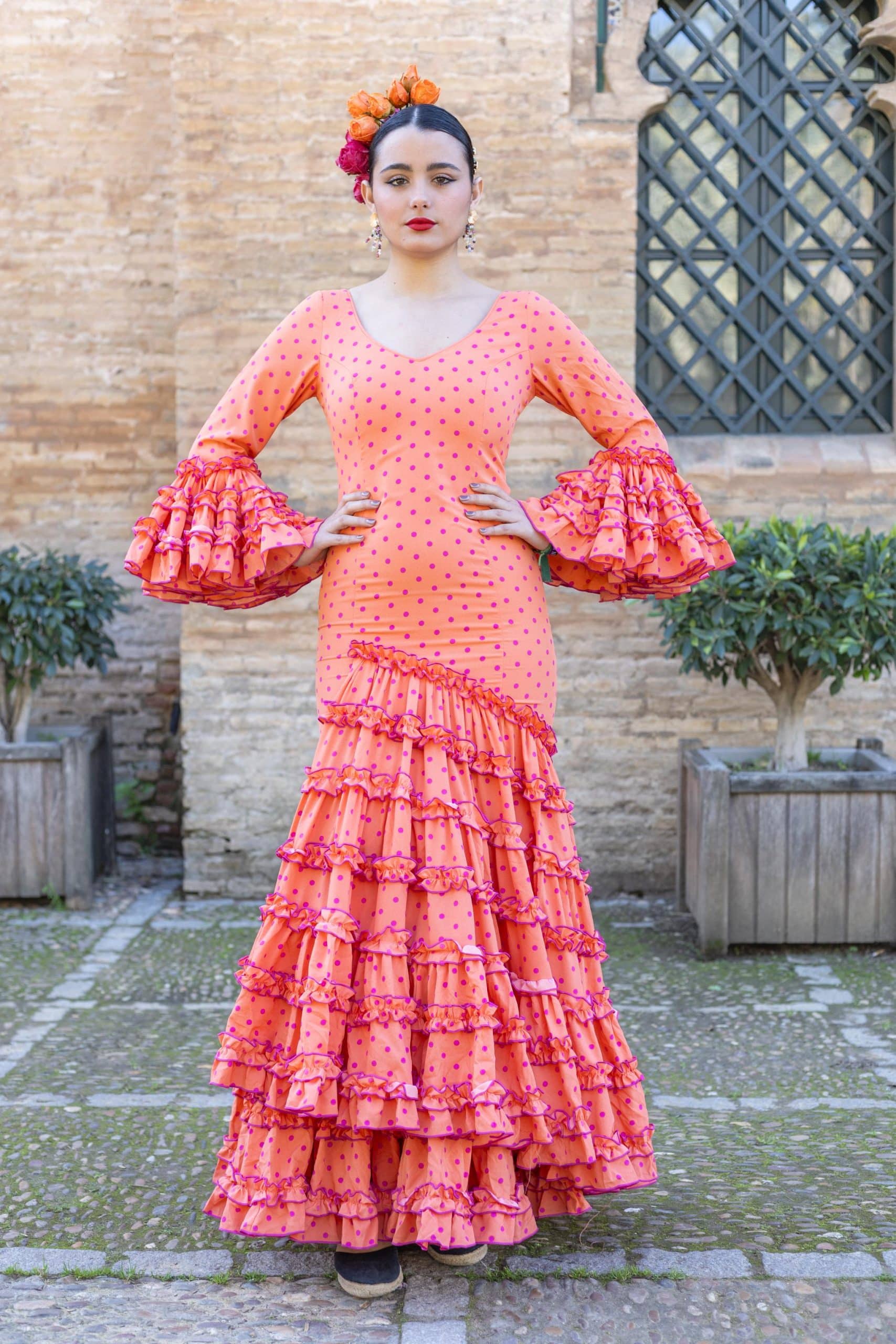 Traje de flamenca con corte canastero y carruchas con subida en pierna derecha color naranja con estampado de lunares rosa fucsia .