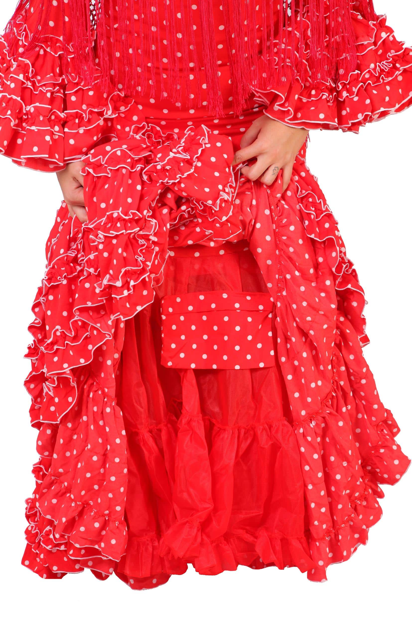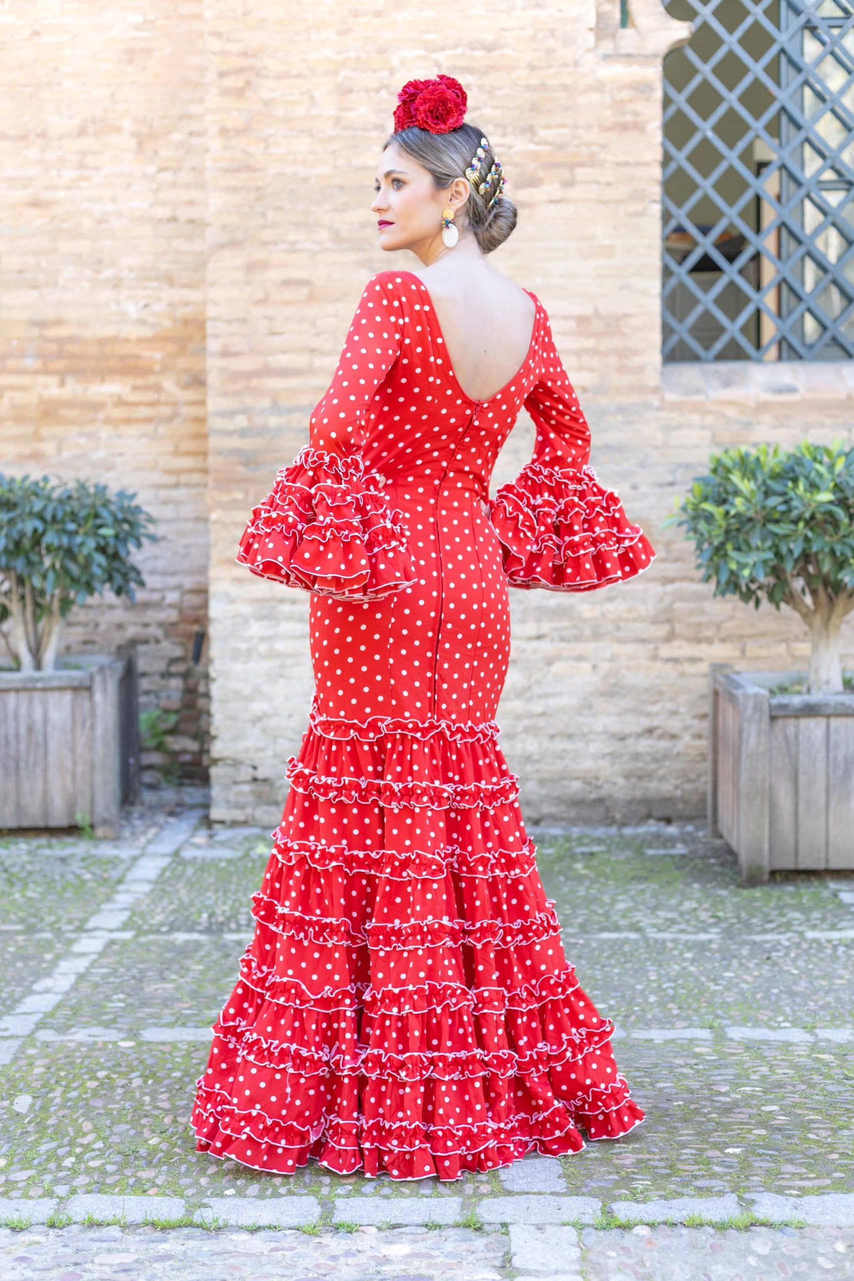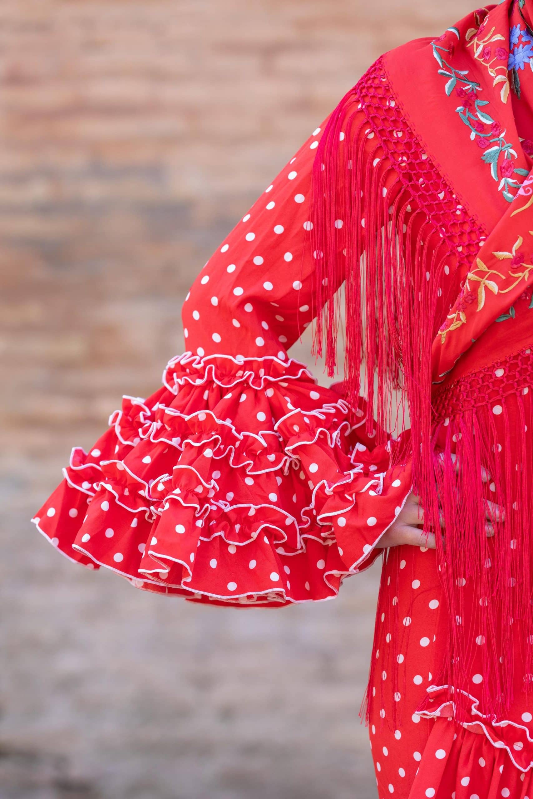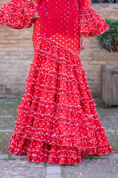 Traje de flamenca con corte canastero y carruchas con subida en pierna derecha color rojo con estampado de lunares blancos .