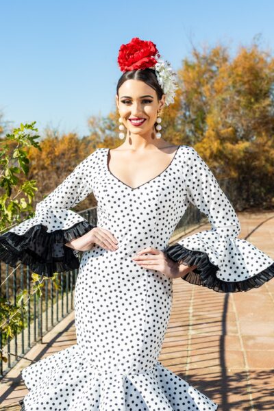 Trajes de flamenca Rocío Negro de lunares Blancos