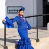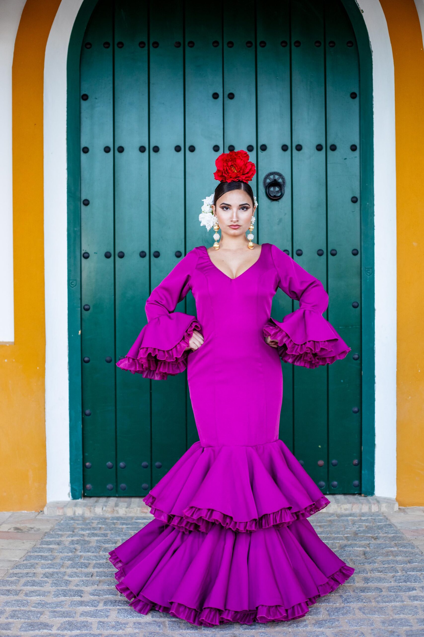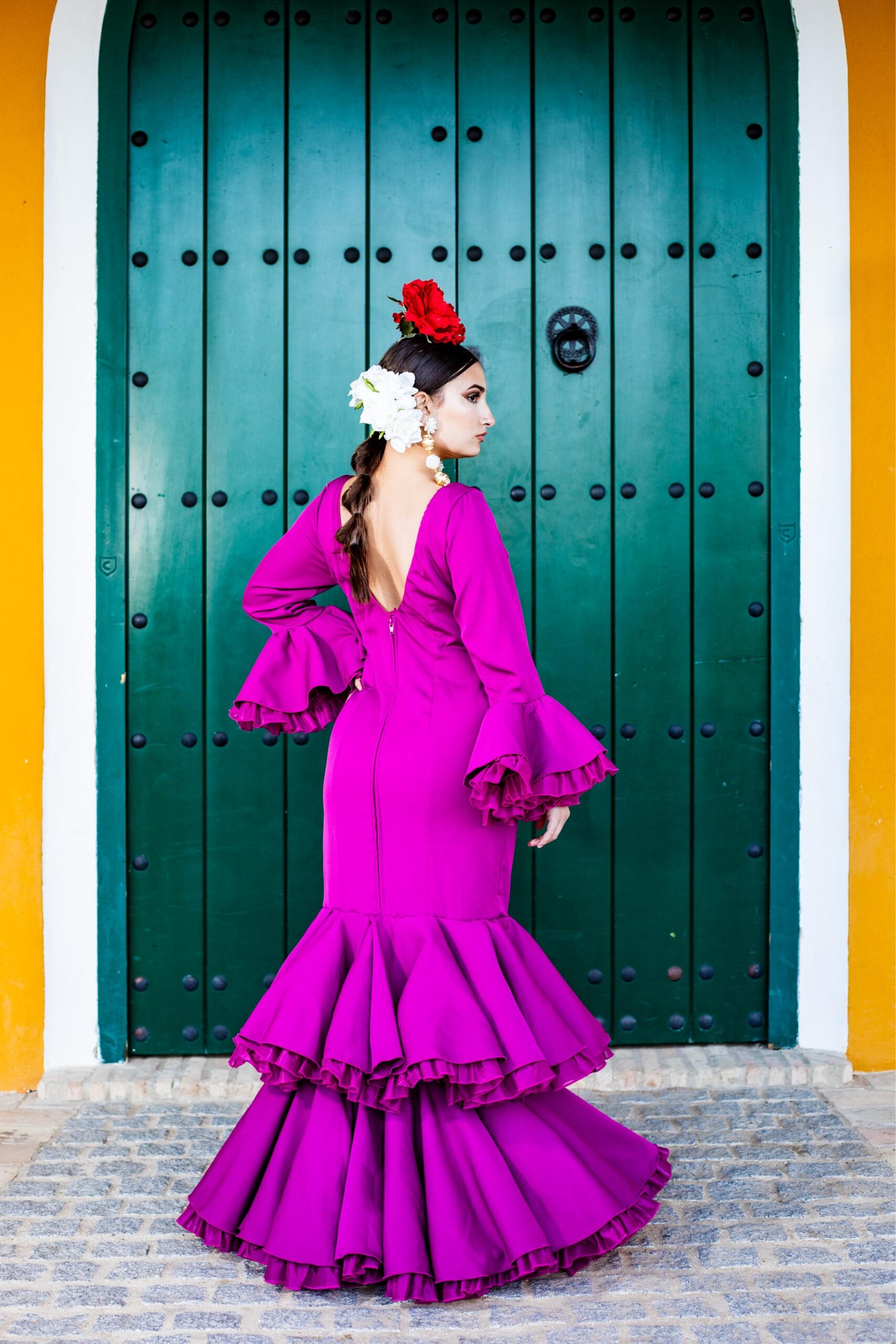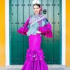 Traje de flamenca de media manga con volantes y falda de dos volantes grandes de organdil con cancán. Tiene bolsillo en el interior de la falda.