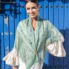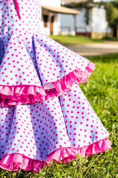 Traje de flamenca de media manga con volantes y falda de dos volantes grandes de organdil con cancán. Tiene bolsillo en el interior de la falda.