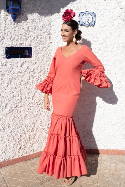 Traje de flamenca de manga larga y falda con adornos de garrucha. La falda cuenta con un bolsillo en su interior.