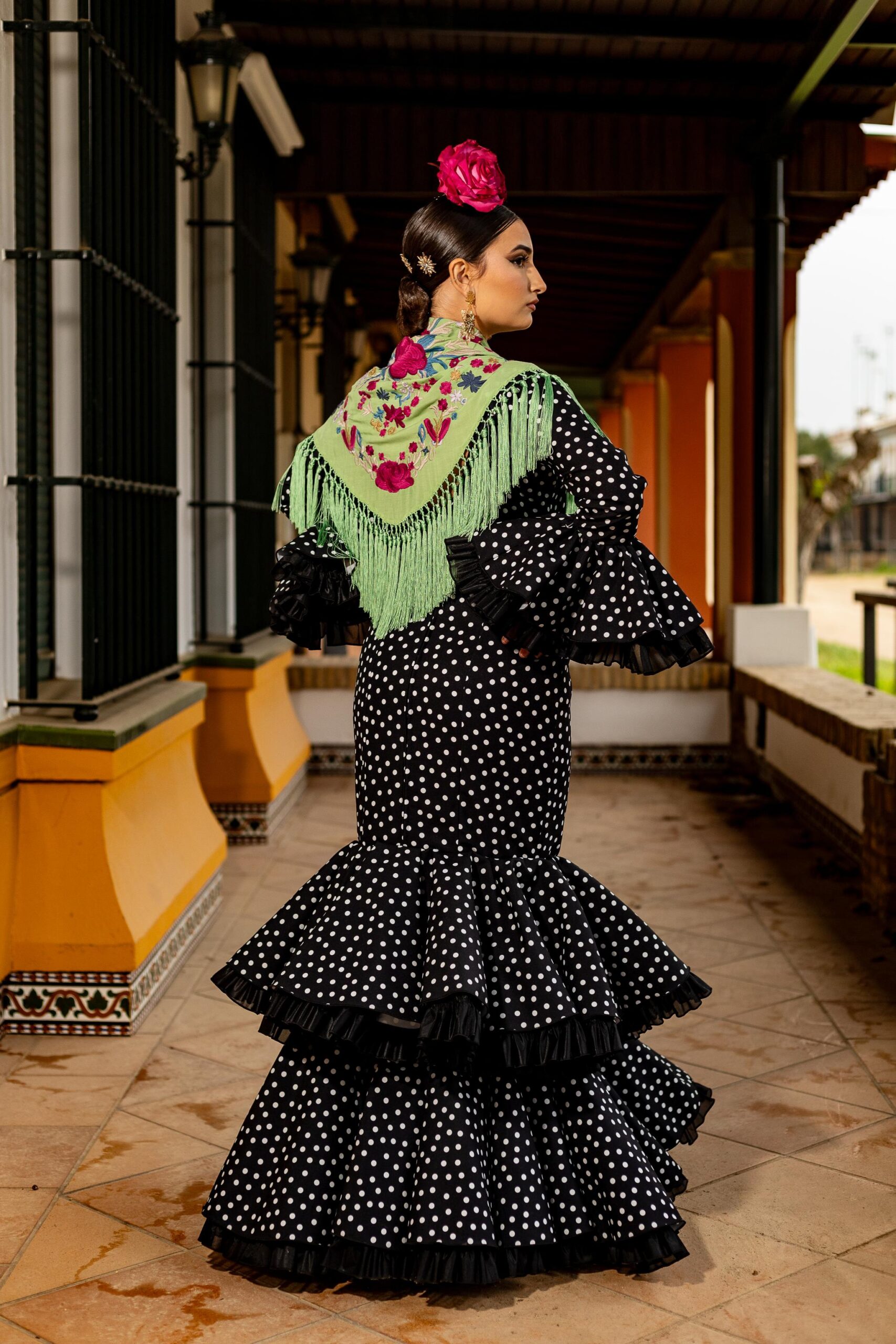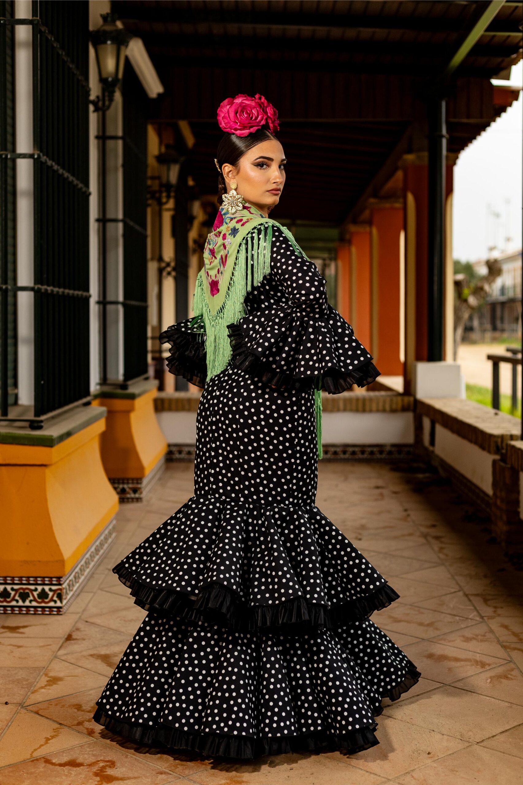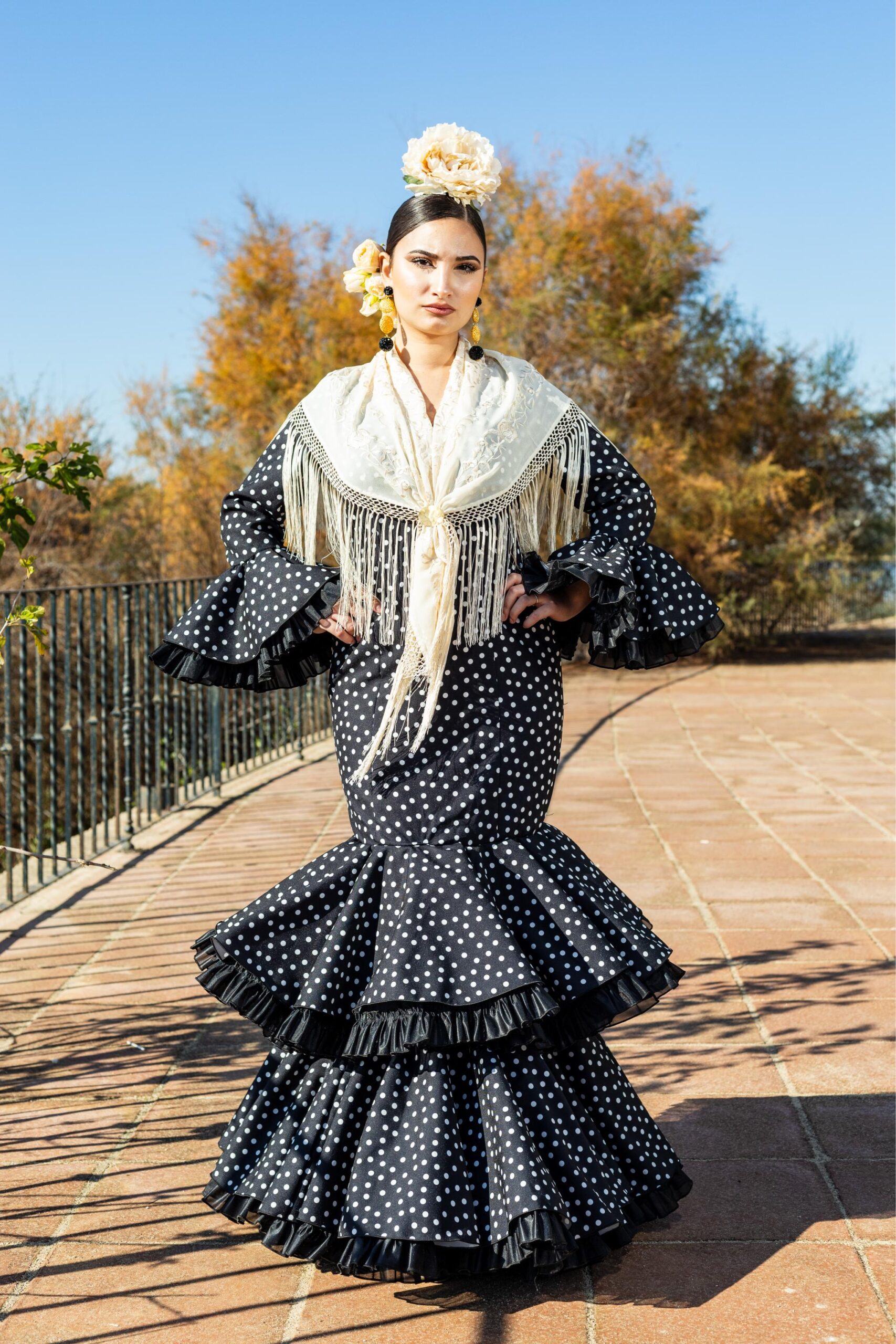 Trajes de flamenca Rocío Negro de lunares Blancos