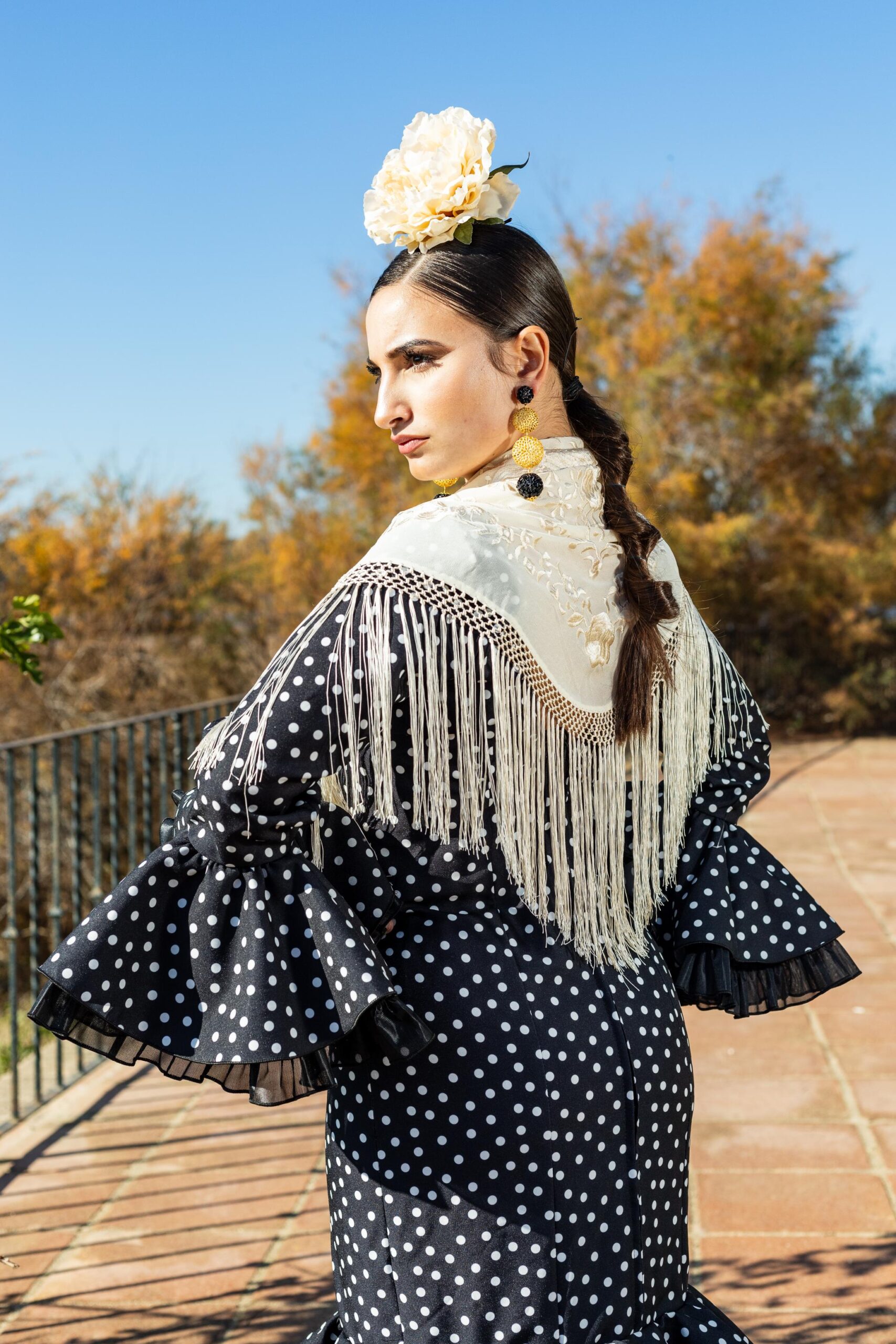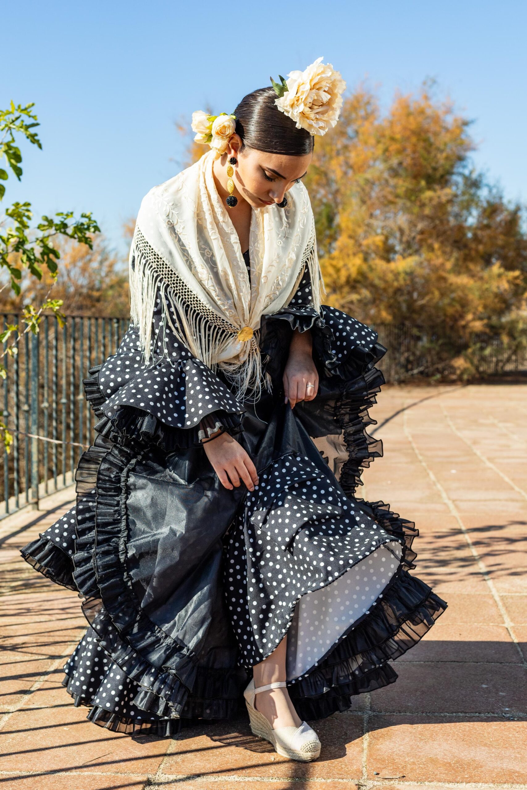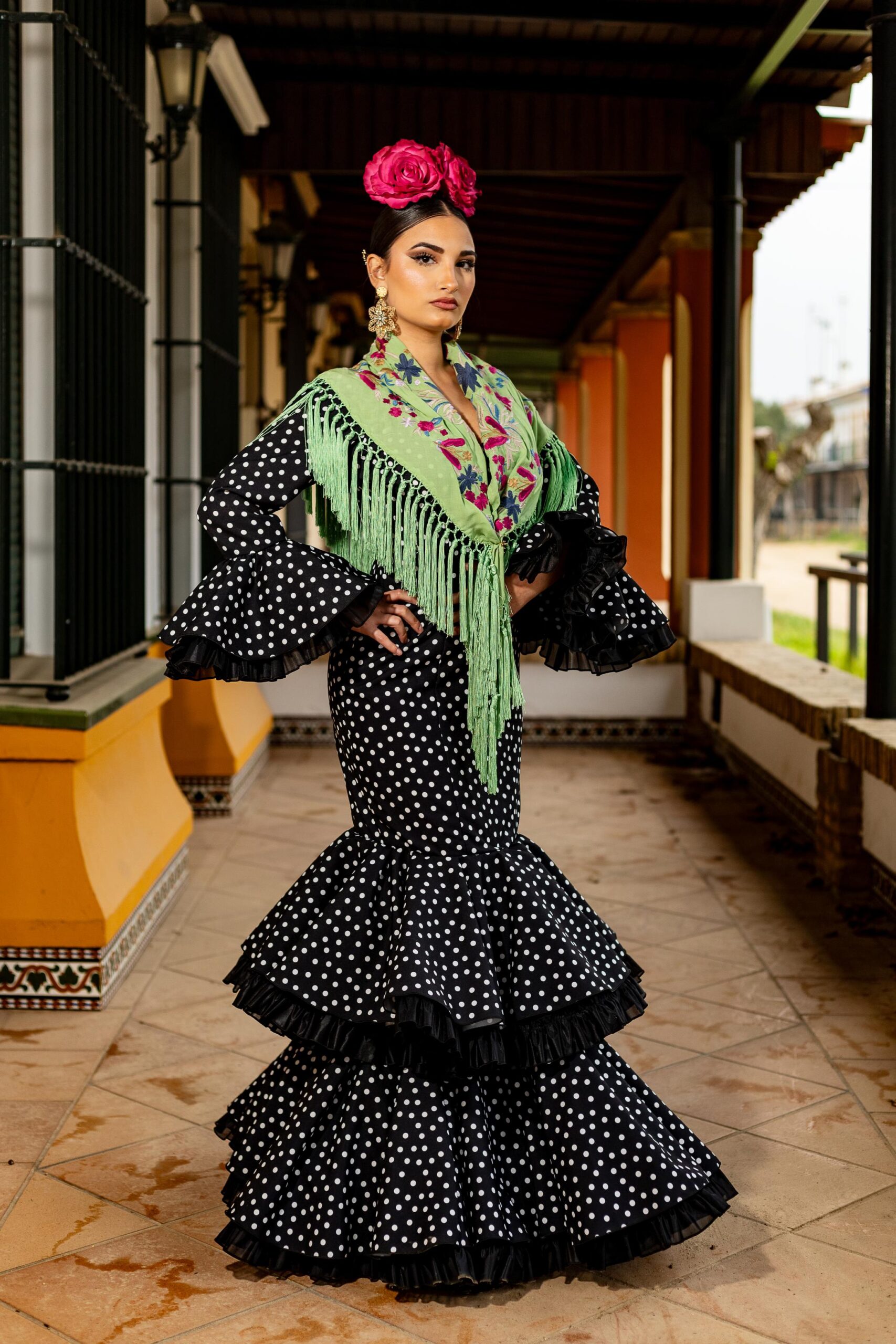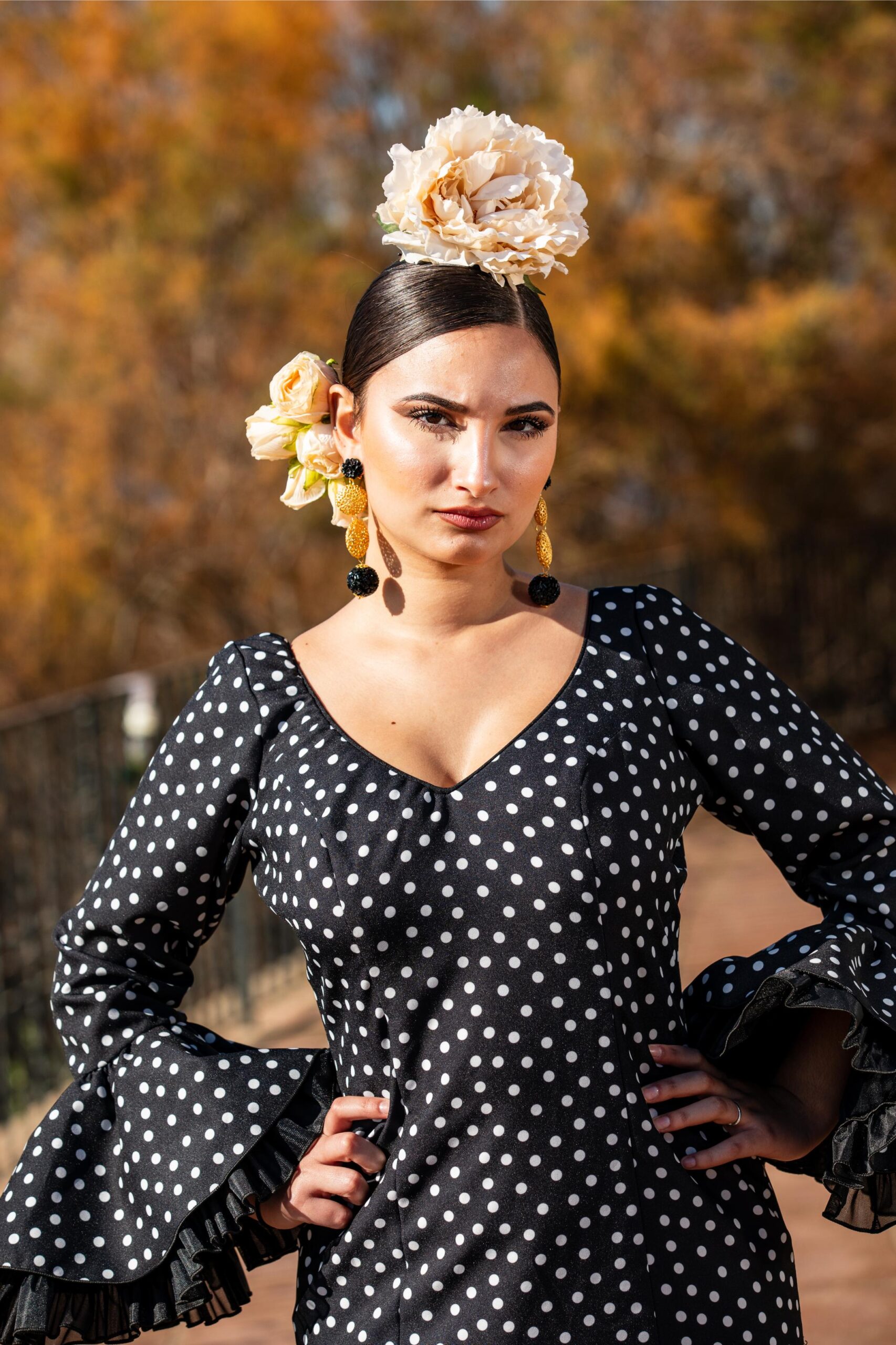Trajes de flamenca Rocío Negro de lunares Blancos